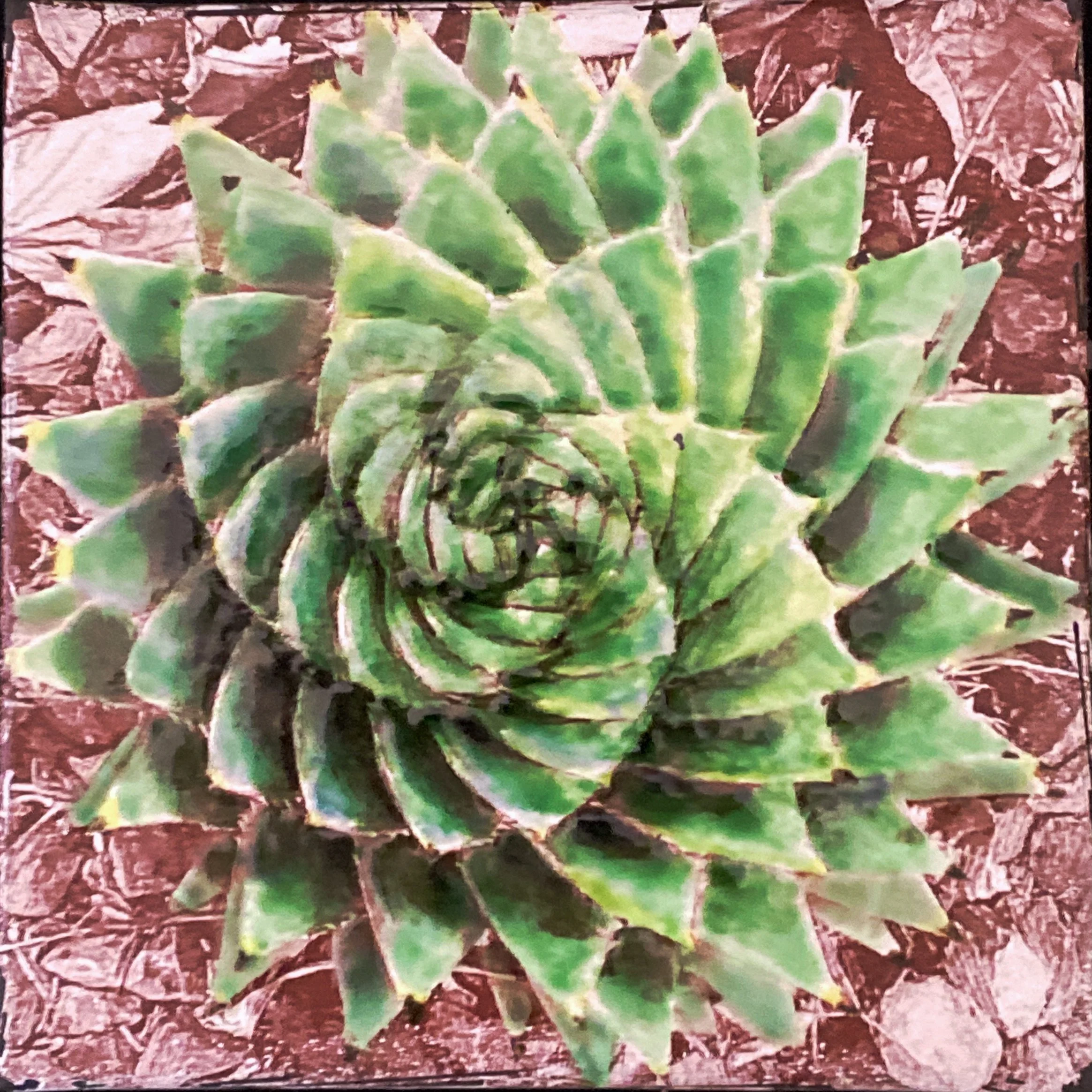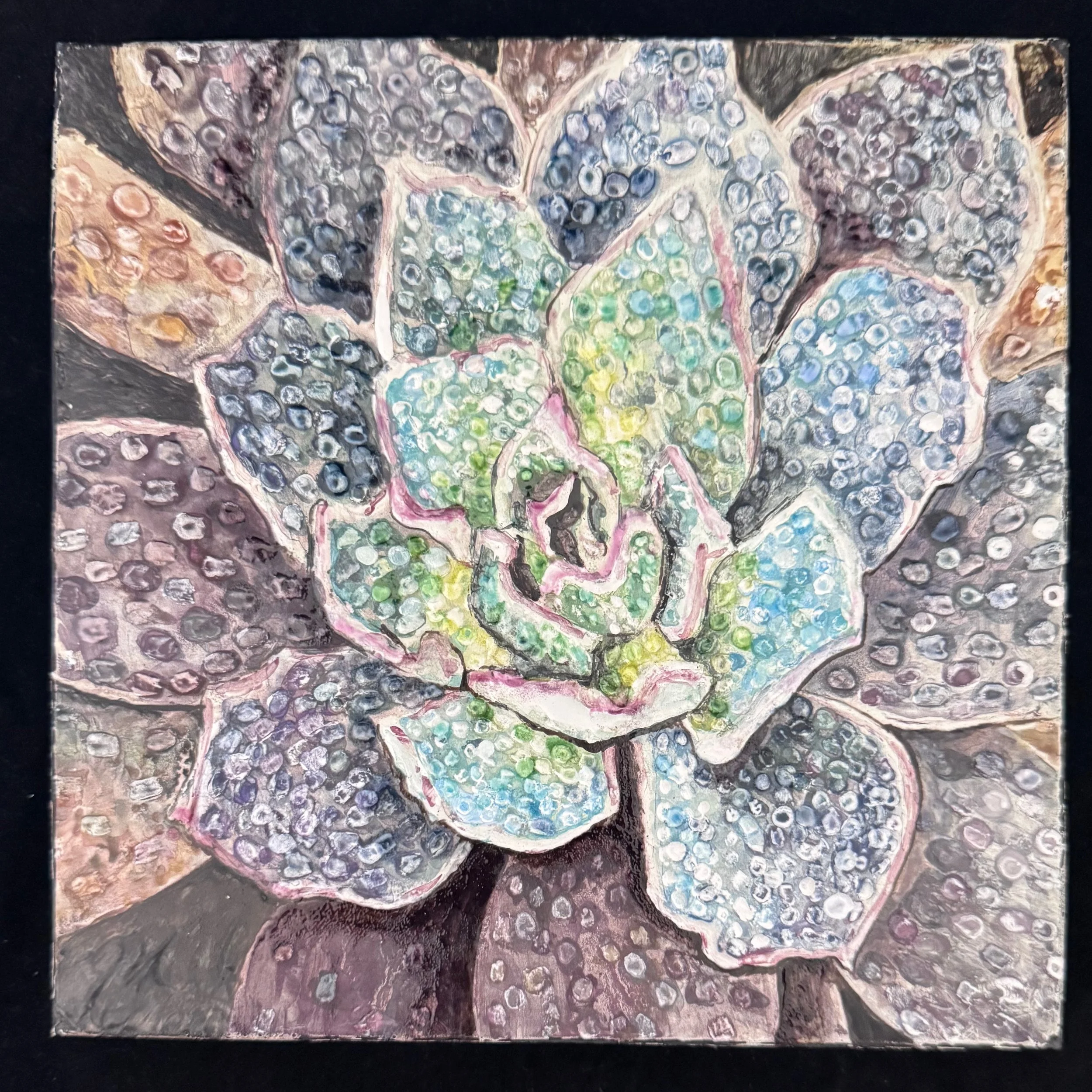 For the final year of the EG WRAP exhibition, I revisit a favourite plant in my work, with this abstract realism work inspired by waterdroplets on Echeveria Afterglow. The work provides a sensory experience, whereby the bumps and textures can be felt as well as seen.